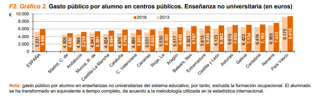 En el curso 2021-2022, la cifra de alumnos fue de 1.599.816 mientras que la inversión media por alumno fue de 5.276€/alumno. Si vemos la siguiente tabla anexa, se comprueba como la inversión por alumno sigue estando lejos de las autonomías que más invierten como muestran estos datos de 2018; Es decir, nuestra inversión por alumno en 2021 está muy alejada de la inversión que ya se hacía en otras autonomías punteras en el año 2018.