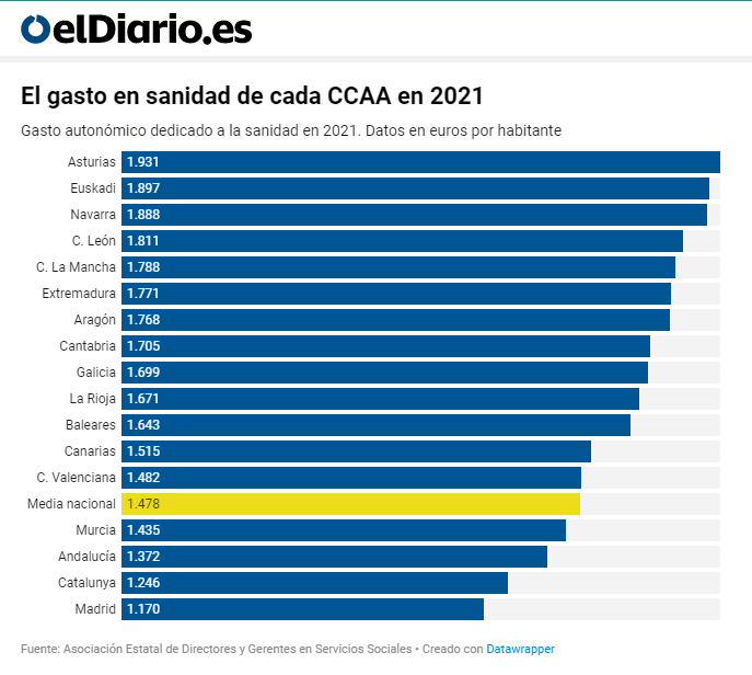 Respecto al gasto sanitario público, la cantidad presupuestada en 2023 asciende a 13.800 millones de euros, si bien, el gasto por habitante sigue siendo de los más bajos de todo el Estado Español, como se indica en esta gráfica: