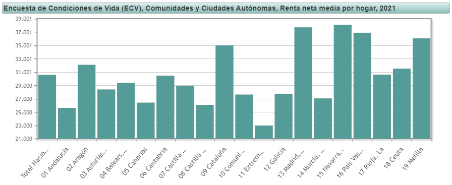Ya hemos visto la gráfica de la renta media neta en el año 2021 por Autonomía, según los dato del INE, y ante ella queda preguntarse, ¿han servido estas políticas para enriquecer a las andaluzas y andaluces? Parece que no. Nuestra renta media no supera los 26.000€. Sólo Extremadura aparece con peor renta media. El resto de Autonomías nos supera.