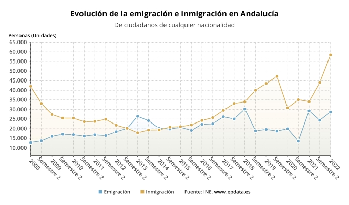 Ésta es la gráfica de la evolución de la inmigración y emigración en Andalucía.