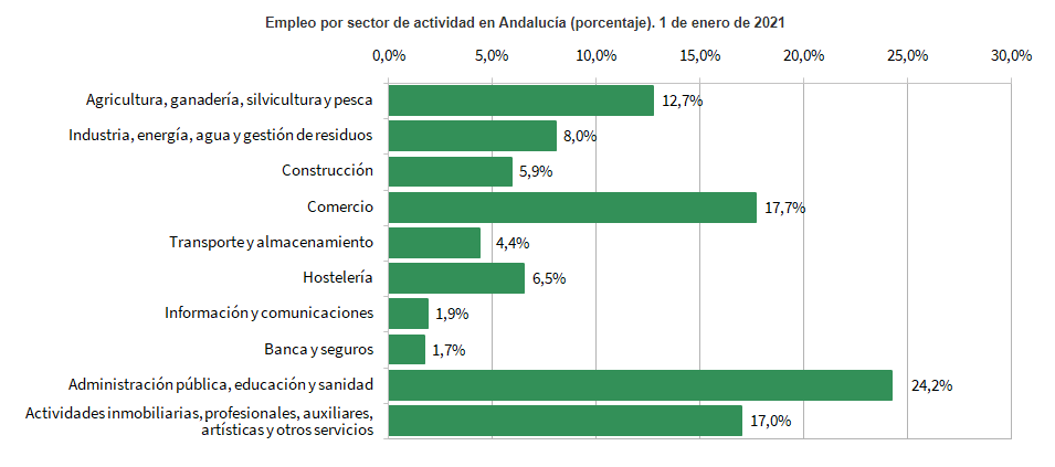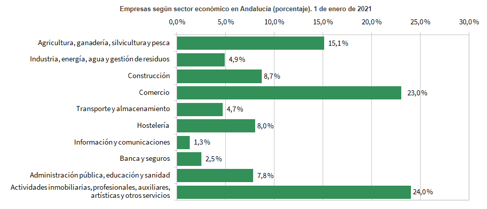 En lo que respecta a los datos que aporta la Junta de Andalucía, según el Instituto de Estadística y Cartografía de Andalucía, encontramos una distribución de la empresas andaluzas respecto a los Sectores Productivos de esta forma (Datos año 2021):