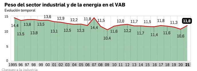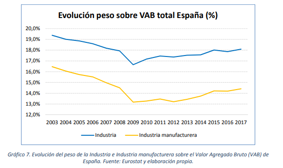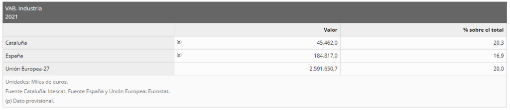 Si nos vamos a las autonomías punteras, en Cataluña, la Industria aporta más de un 20% del VAB, aportando 45.462 millones de euros.