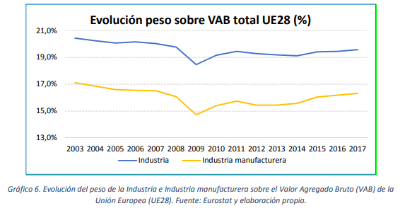 Si vemos la evolución del Peso de la Industria y de la Industria Manufacturera en el VAB de Europa, comprobamos lo alejadas que están nuestras cifras de las europeas.